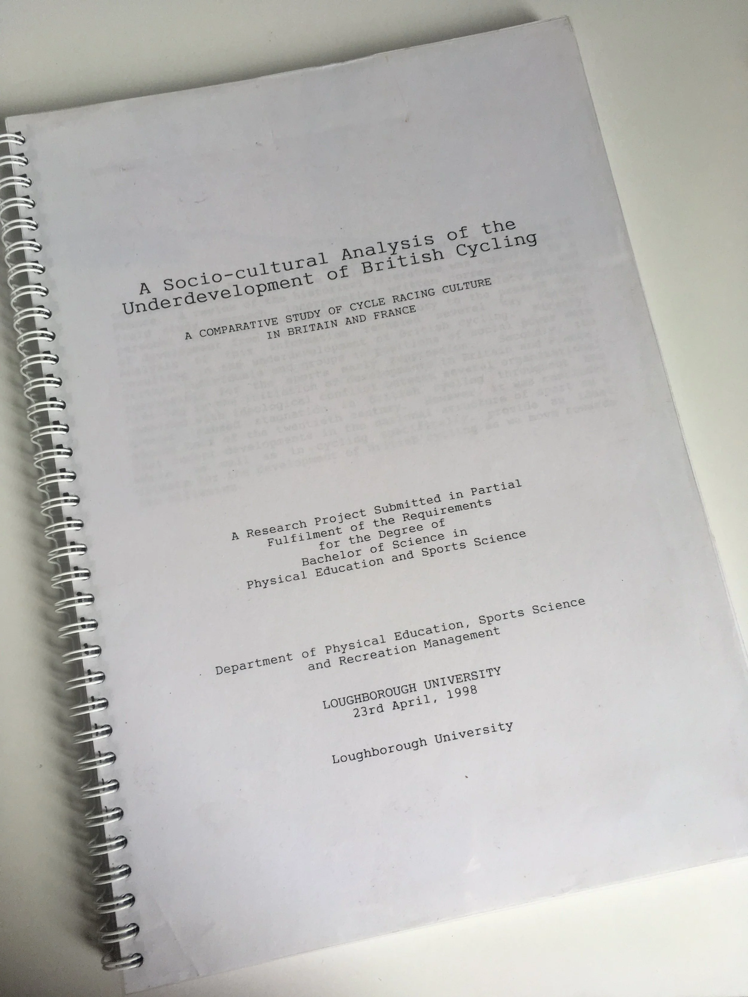 After several short trips to France racing in the summer holidays, during my final year studying at Loughborough University I chose to write my dissertation as a comparative study of the development of Cycling in France and Britain, using the Tour de France as an obvious place to start the story. I recently rediscovered this weighty tome and re-read it with fresh eyes, as you often do when looking back at something from your own personal history.